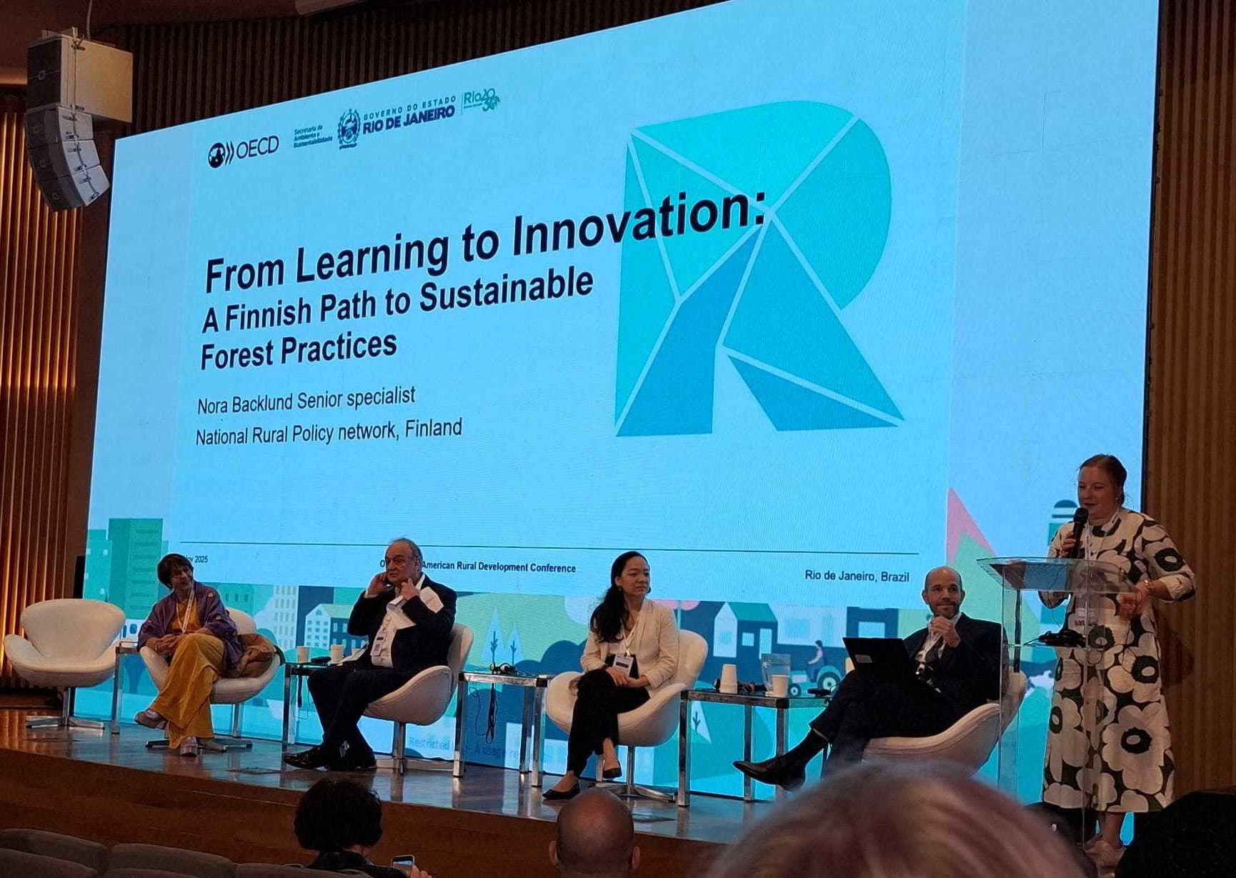 Reserapport från OECD:s konferens om landsbygdsutveckling i Rio de Janeiro, där man diskuterade landsbygdens och stadens samspel, resiliens och en rättvis omställning. Finlands anförande lyfte fram betydelsen av hållbart skogsbruk och skogsfostran, medan lokala perspektiv betonade blå ekonomi och möjligheter till hållbar livsmedelsproduktion.